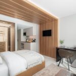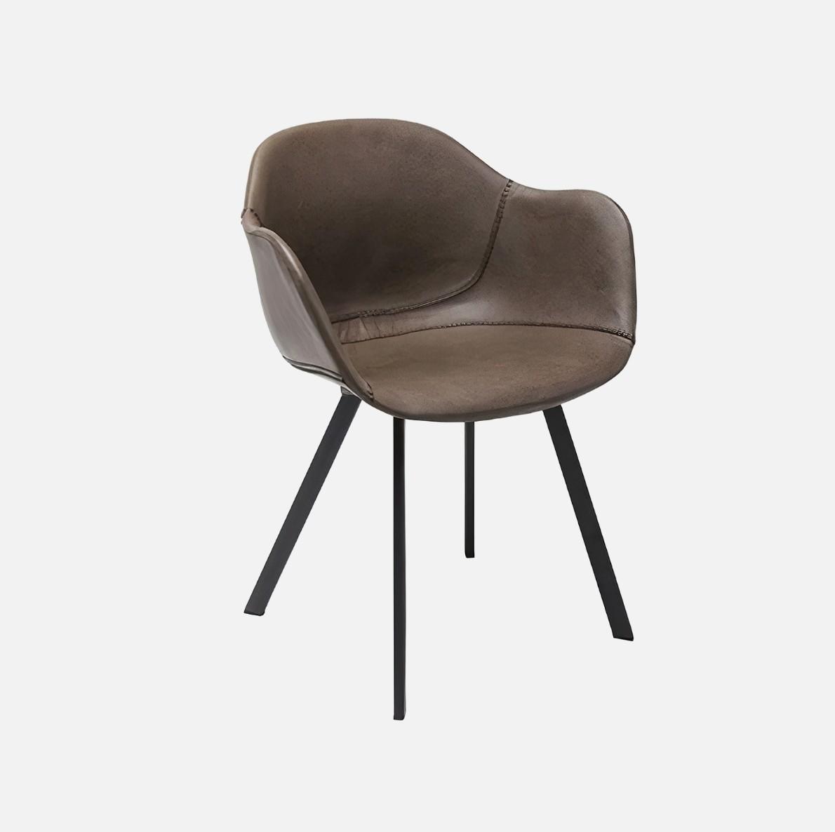 Modern accent chair featuring a curved, upholstered seat with detailed stitching and sleek metal legs. Designed for both comfort and style, it’s perfect for dining areas, offices, or contemporary living spaces.