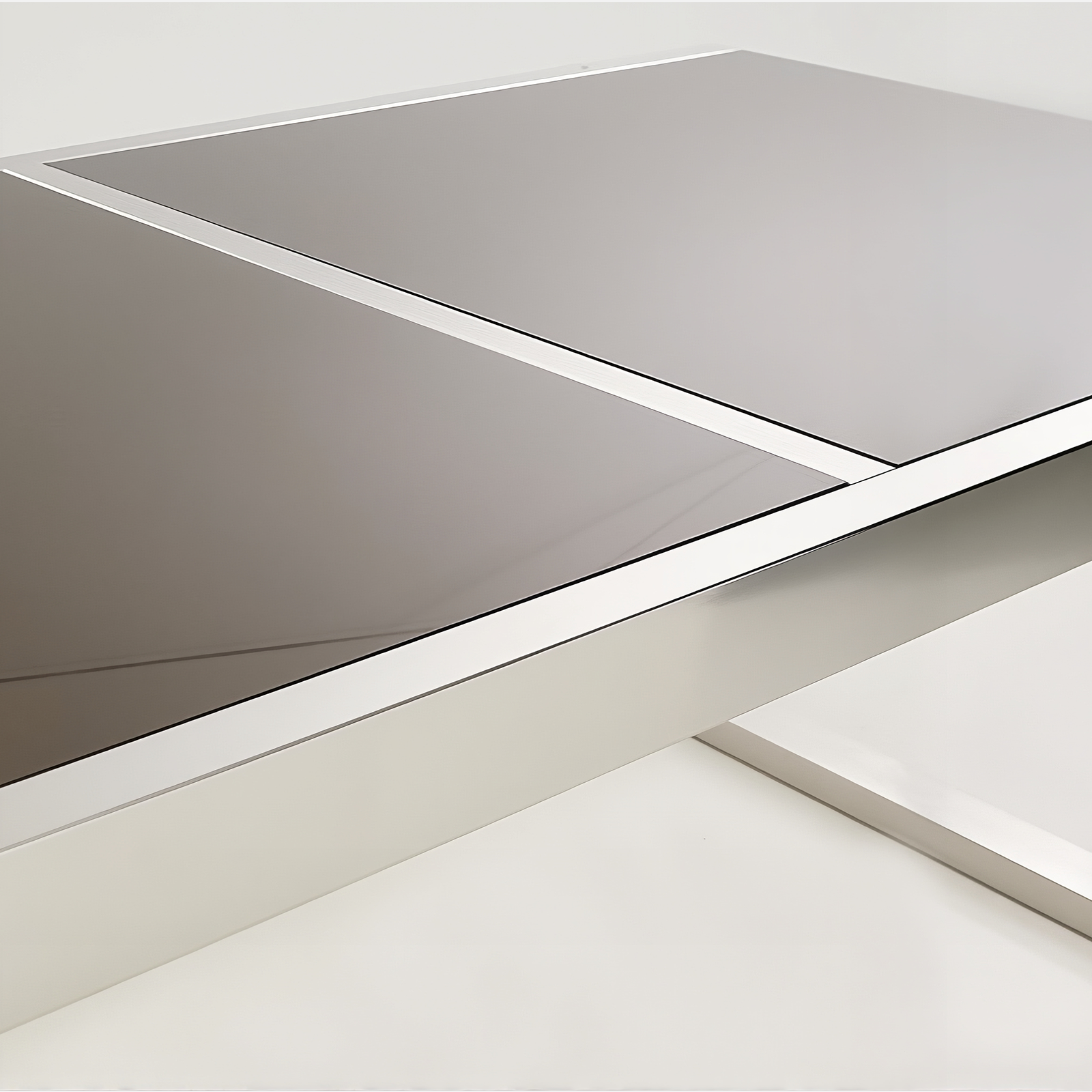 This is a modern rectangular dining table with a mocha-colored glass top and polished chrome steel legs. Its reflective finish and sleek, geometric frame give it a luxurious, contemporary aesthetic, perfect for upscale dining rooms or conference spac