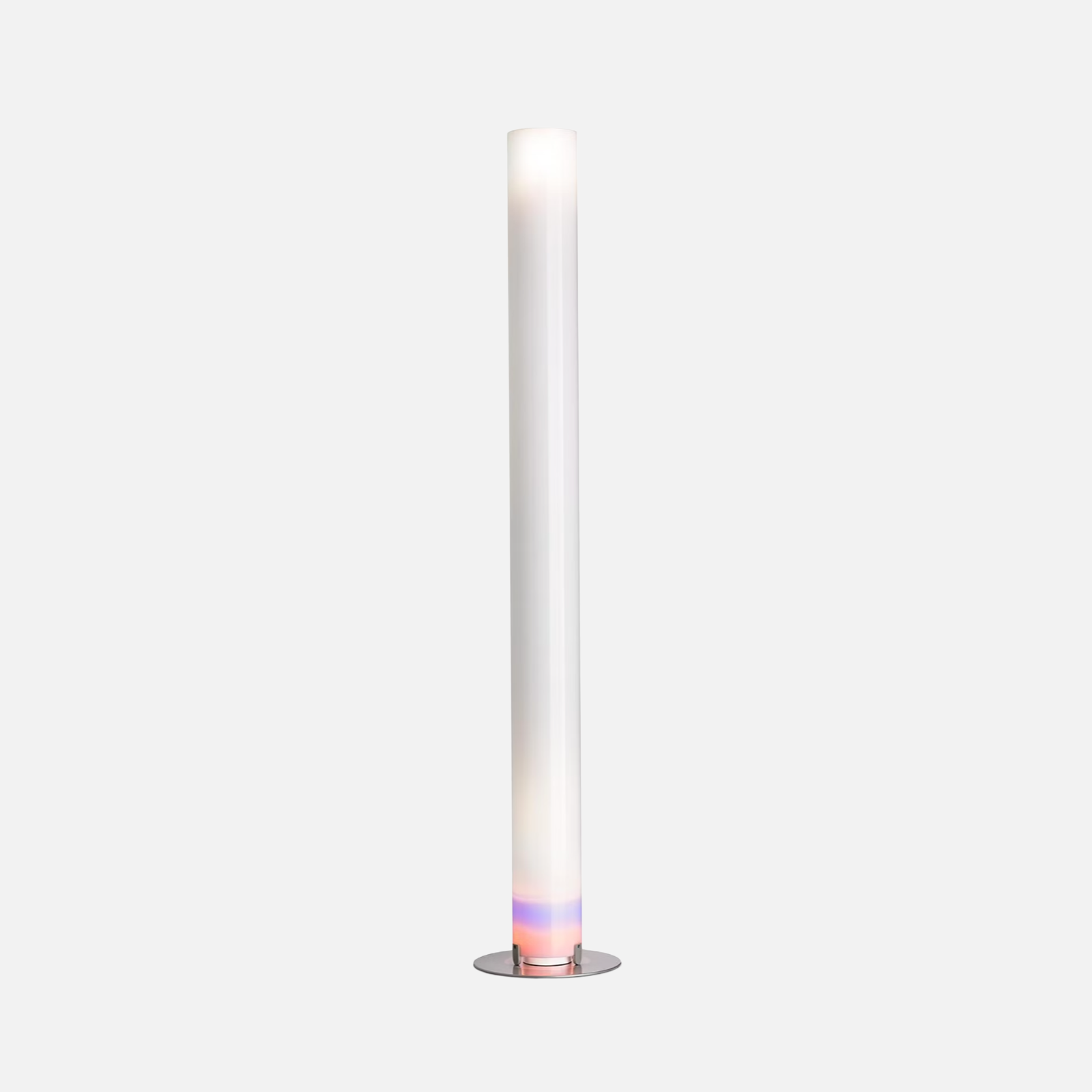 The Flos Stylos Floor Lamp is a striking modern lighting piece designed to enhance any interior with its sleek and minimal aesthetic. Its cylindrical body is crafted from opal polycarbonate, diffusing light evenly for a soft, ambient glow. The lamp i
