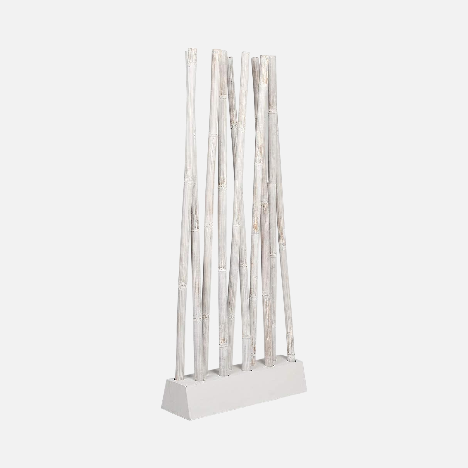 Decorative bamboo room divider measuring 100x250cm, crafted from natural bamboo poles mounted on a sturdy white base. Adds an organic, stylish touch to interiors, perfect for dividing spaces or enhancing modern décor.