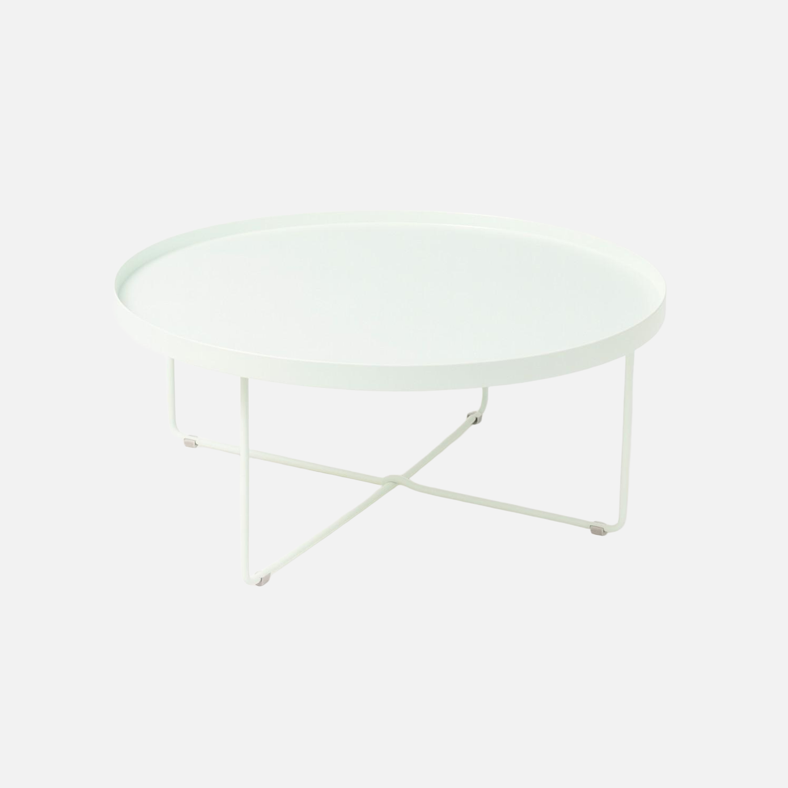 Round salon table with a minimalist design, featuring a smooth tray-style top and slender metal legs with a cross-frame base. Its light, modern look makes it a versatile choice for contemporary living rooms.