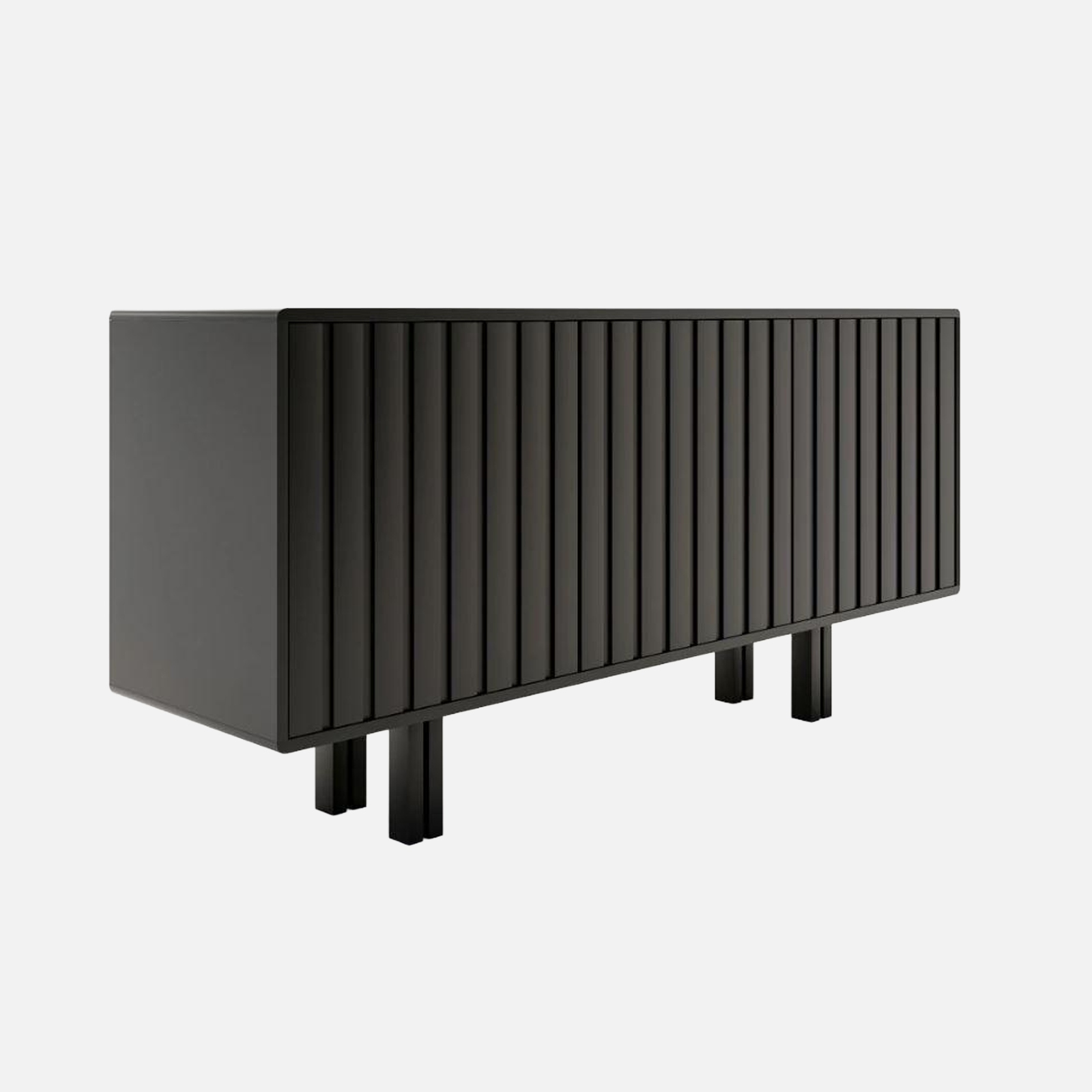 The VIGO sideboard features a sleek black MDF design with elegant vertical grooves, creating a modern statement piece. Its generous storage space makes it perfect for dining or living rooms, combining functionality with minimalist sophistication.