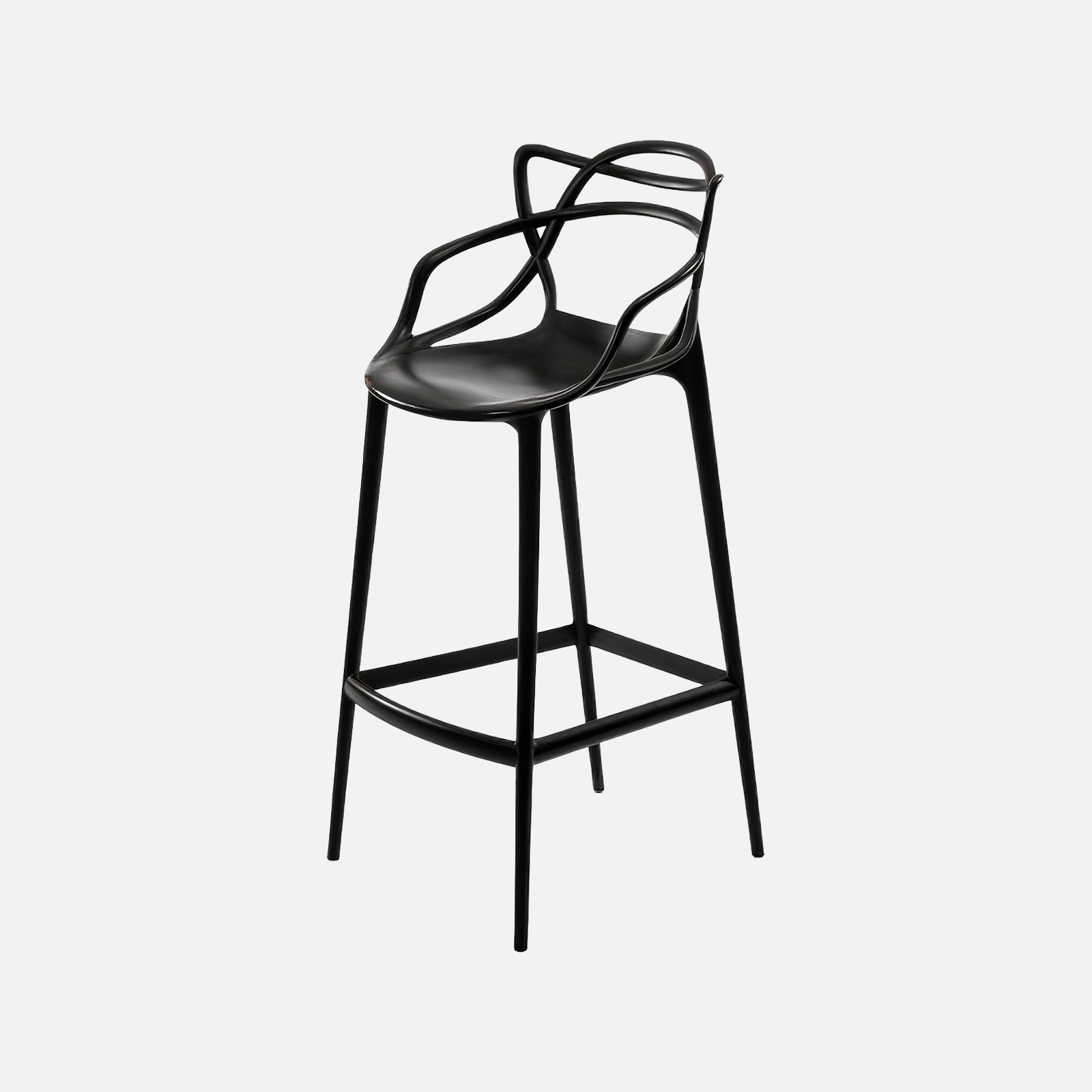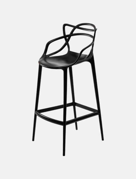 Leichter und praktischer Barstuhl aus modifiziertem Polypropylen. Einzigartige, sich kreuzende Linien, die die Rückenlehne des Stuhls bilden, schaffen ein Interieur in originellem und ansprechendem Stil.
