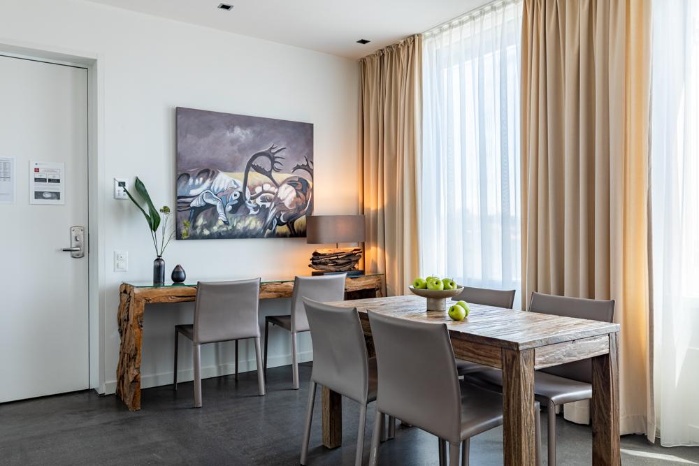 Stilvoller, eleganter und exquisiter Esstisch mit mattschwarzen Stahlbeinen und einer Tischplatte aus schwarzem Eichenholz.