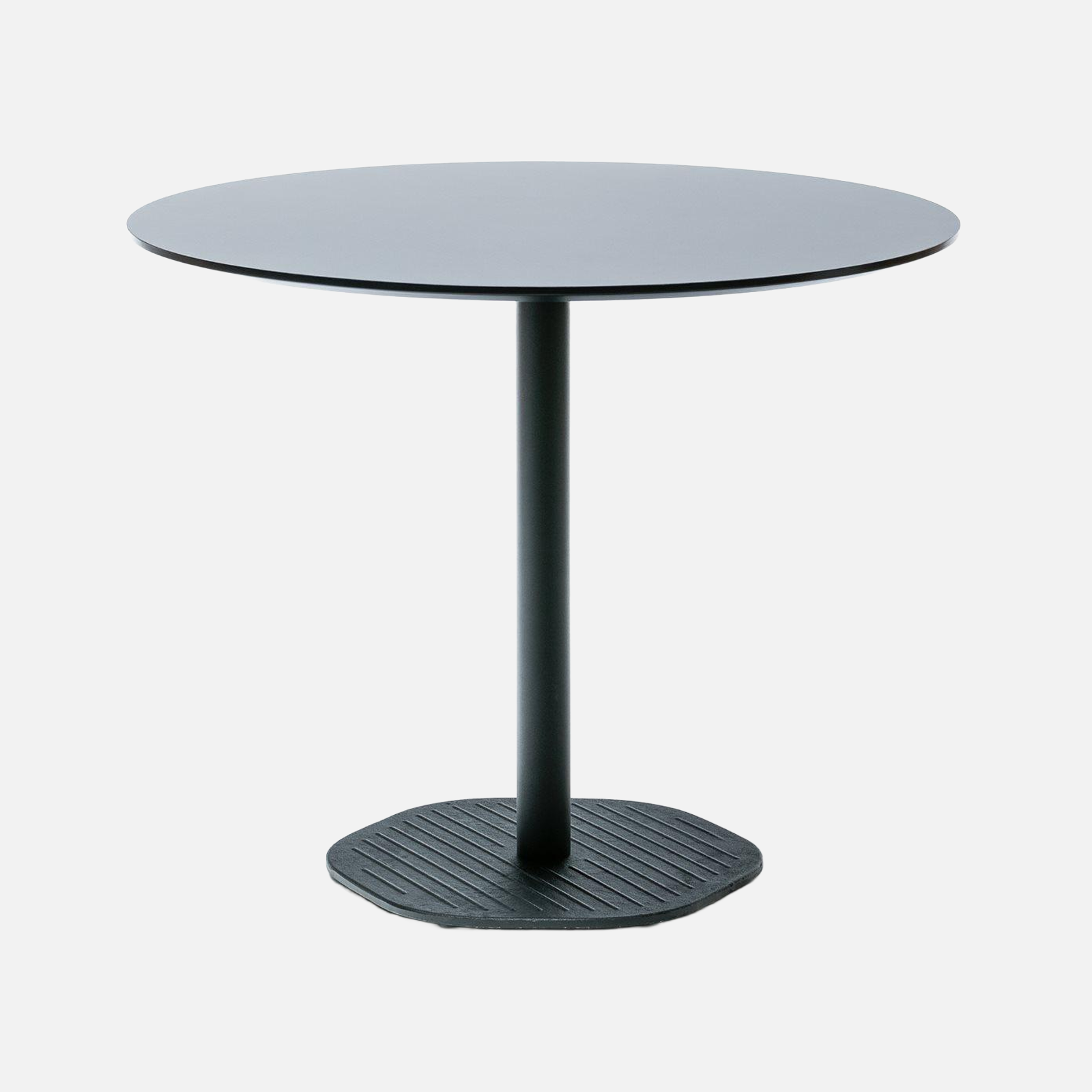 Tisch bestehend aus einem sechseckigen Gusseisenfuß und einer widerstandsfähigen Platte. Er ist inspiriert von industriellen Elementen der 80er Jahre.