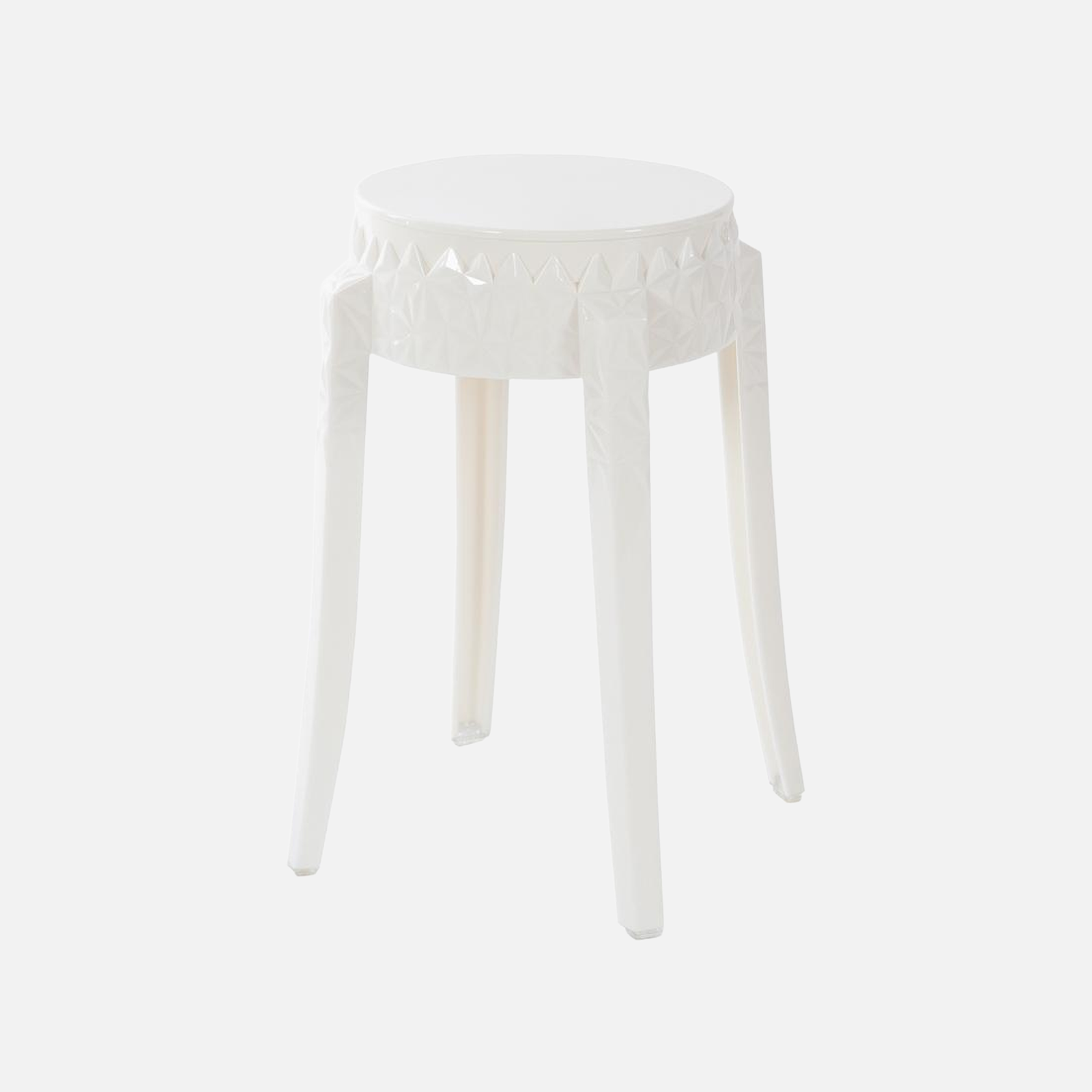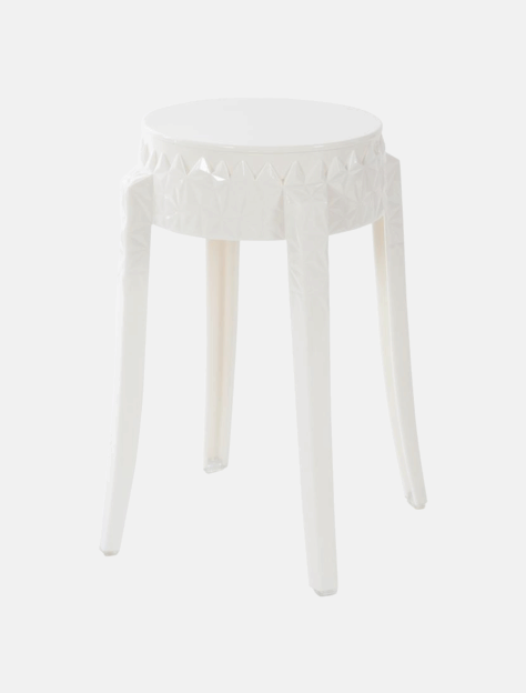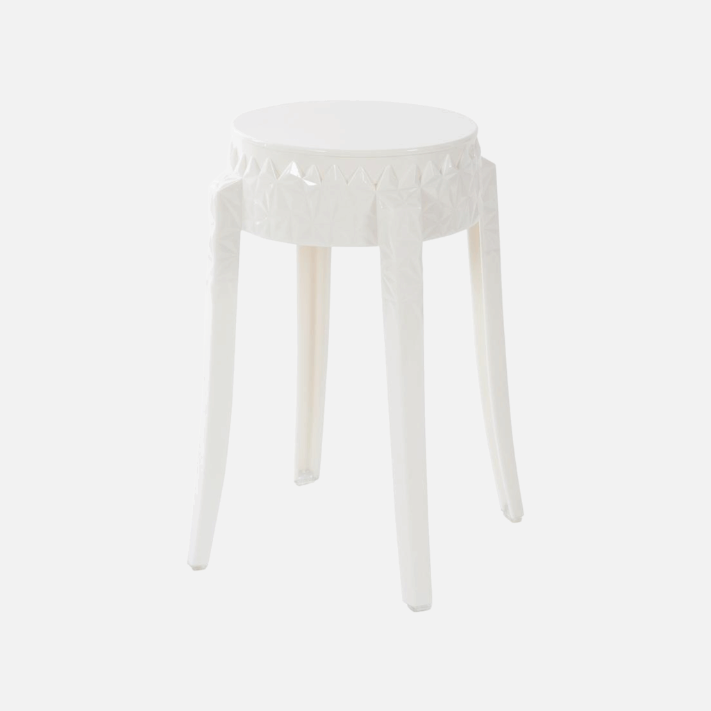 Eleganter und stilvoller Hocker aus Acryl mit dekorativen Schnitzereien.